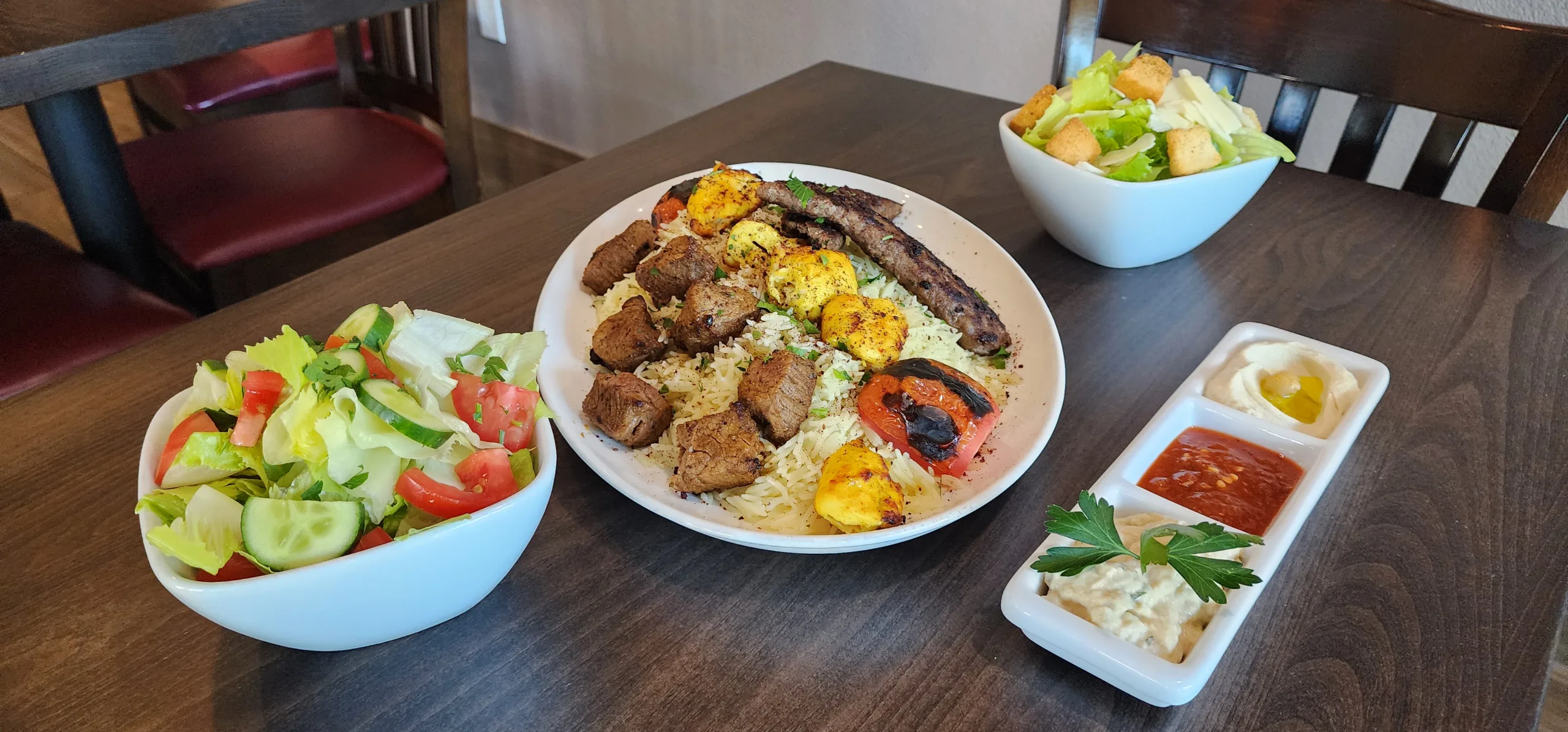 Your Choice of Two Kebabs & One Kufta Kebab on top of Rice Served W/ Hummus, Baba Ghanoush & Hot Sauce